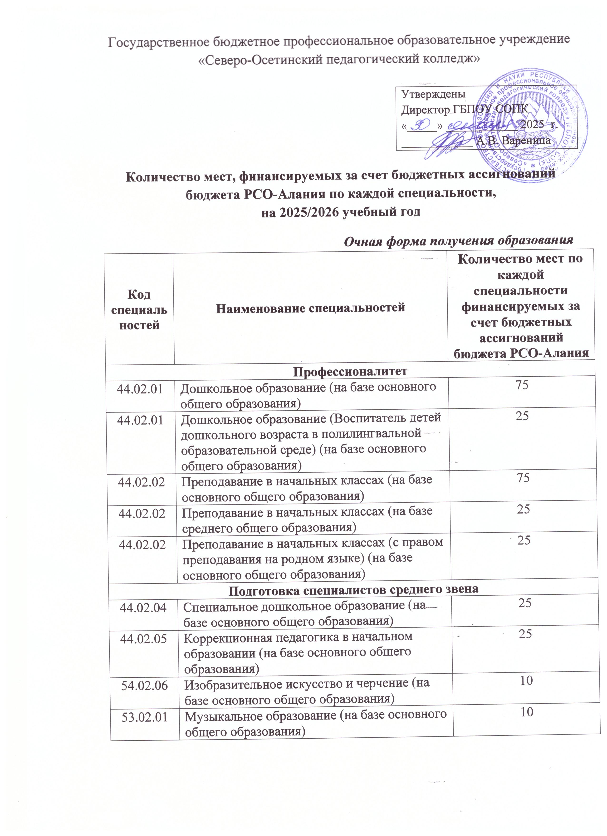 | Количество мест, финансируемых за счет бюджетных ассигнований бюджета РСО-Алания по каждой специальности | Скачать документ |