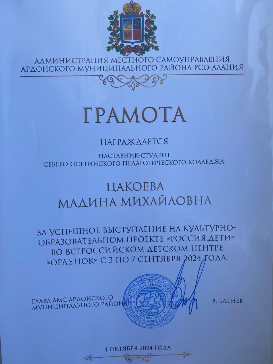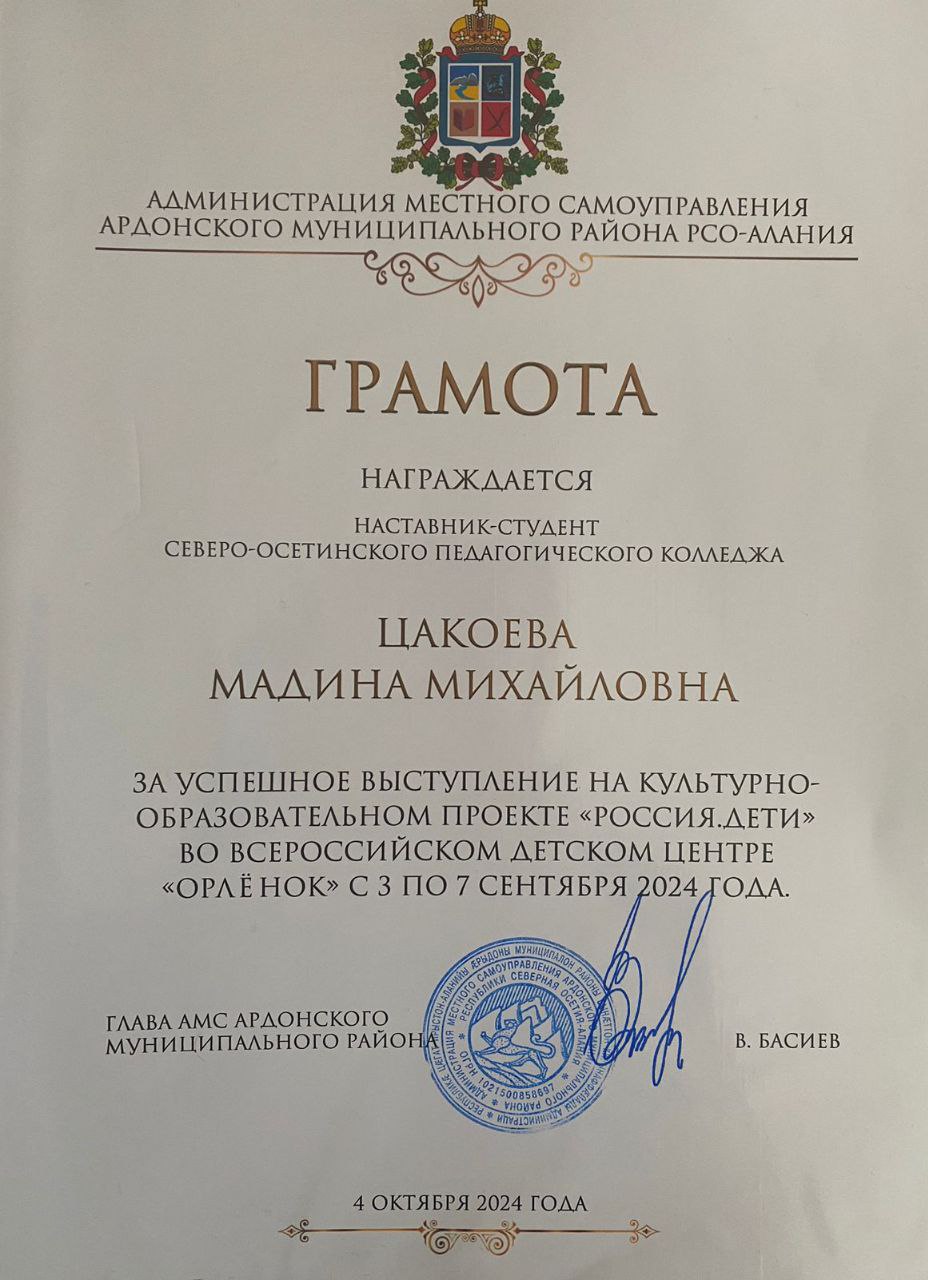 4 октября, накануне празднования Дня учителя, в Администрации местного самоуправления Ардонского района были вручены грамоты студентам-наставникам 4 курса отделения музыкального образования Северо-Осетинского педагогического колледжа и их руководителю - преподавателю СОПК Людмиле Сергеевне Мамуковой.