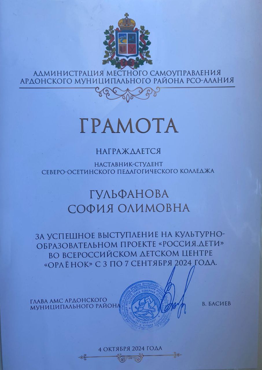 4 октября, накануне празднования Дня учителя, в Администрации местного самоуправления Ардонского района были вручены грамоты студентам-наставникам 4 курса отделения музыкального образования Северо-Осетинского педагогического колледжа и их руководителю - преподавателю СОПК Людмиле Сергеевне Мамуковой.